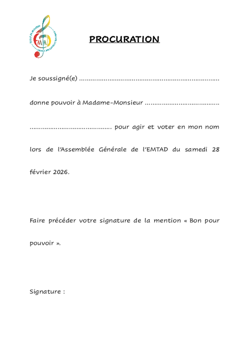 Nous lançons un appel appuyé à toutes les personnes souhaitant s’impliquer dans la vie de l’association : votre engagement est indispensable pour permettre à l’école de poursuivre sa mission, de maintenir la qualité de son enseignement et de continuer à faire vivre la pratique musicale sur notre territoire. S’engager au sein du Conseil d’administration, c’est donc participer activement à la vie de l’école, contribuer aux décisions importantes et œuvrer collectivement pour faire vivre et grandir notre structure. Les adhérents et adhérentes souhaitant rejoindre le Conseil d’administration sont invités à se faire connaître dans les meilleurs délais auprès des membres du bureau (ecole.musique.tad@gmail.com).